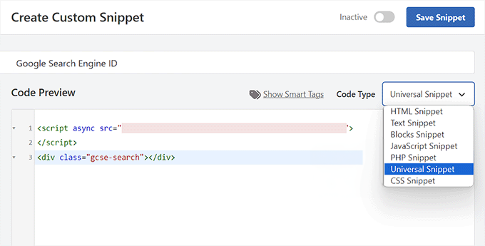 Po zainstalowaniu WPCode, dodaj nowy fragment kodu, wklejając ID wyszukiwarki Google.